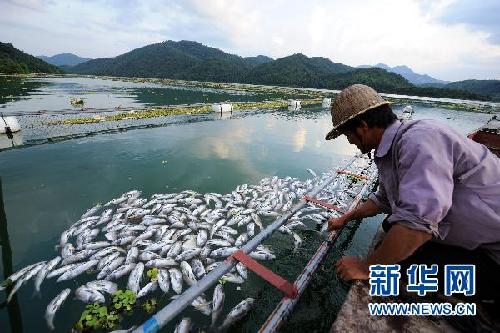 福建省永定縣洪山鄉養殖戶在棉花灘水庫查看因紫金礦業污染事故致死的網箱魚(7月13日攝)。 新華社記者姜克紅攝