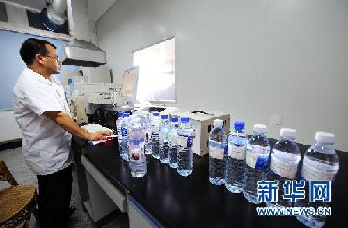 7月14日,福建省上杭縣衛生防疫站工作人員在用儀器檢測各自來水廠送來的水樣。 新華社記者 姜克紅 攝