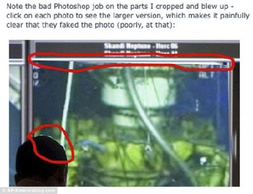 ????上周末,BP網站上出現一張得州休斯敦市指揮中心的工作照。照片顯示,幾名工作人員正在監控10個巨大的視頻顯示器,畫面顯示的均是墨西哥灣漏油的畫面。BP發言人斯科特·迪恩日前承認,事實上其中有幾個屏幕并沒有圖像,但為了制造效果,一名攝影師利用Photoshop軟件在空白屏幕上添加了虛假畫面。目前BP已經將原圖在網站上公布。