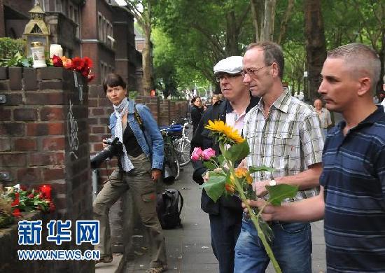 7月25日,在德國杜伊斯堡,當?shù)孛癖娫诓忍な录l(fā)生地附近為遇難者獻花。新華社記者胡小兵攝