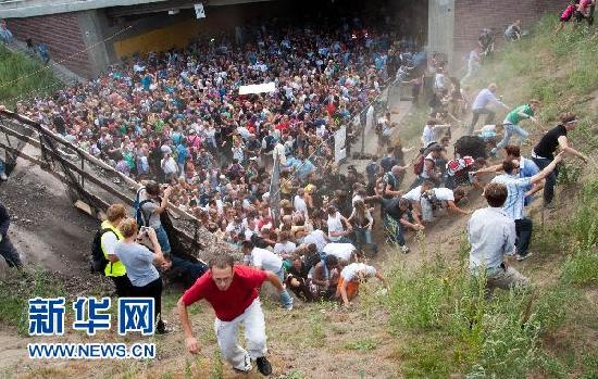 7月24日,在德國西部杜伊斯堡,參加“愛的大游行”音樂節的人群發生惶恐后奪路而逃。新華社/法新