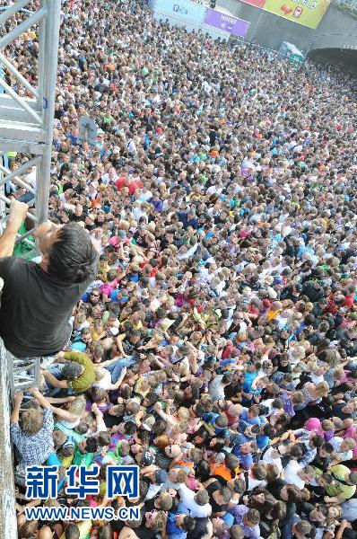 7月24日,在德國西部杜伊斯堡,人們試圖爬上欄桿躲避擁擠。新華社/法新