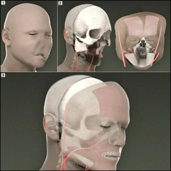 ????最終,在一位名叫巴萊特大夫(JP Barret)的率領下,一組醫(yī)生經過長達24小時的一系列神經肌肉和美容手術,成功地向患者面部重植肌肉、鼻子、嘴唇、上頜骨、軟口蓋、全部牙齒、臉頰骨等面部功能器官。