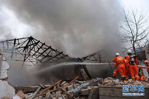 ????當日上午,南京市塑料四廠發生爆炸。據江蘇省公安消防總隊有關人員介紹,發生事故現場為棲霞區南京塑料四廠拆遷工地,由于丙烯管道被施工人員挖斷,泄漏后發生爆炸。南京市消防支隊已經派出15輛消防車、85名官兵趕赴現場,對周邊被引燃的車輛和建筑殘火進行撲救,控制火情。截至發稿時,消防隊員已經關閥斷氣,只有少量余火。目前,攜帶生命探測儀和搜救犬的消防隊員正在搜救埋壓人員。新華社發(張蘇杰 攝)