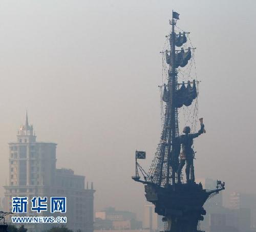 7月27日,俄羅斯首都莫斯科的彼得大帝雕像被籠罩在煙霧中。新華社記者魯金博攝