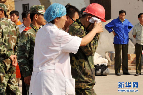 8月7日,醫(yī)護(hù)人員在照顧升井礦工。新華社記者 朱崢 攝