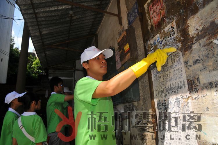 8月14日,青年志愿者在清理新興市場附近住宅樓外墻上的非法小廣告。李鴻榮 攝