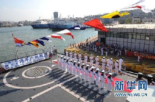 8月9日,中國海軍護航編隊中的“廣州”艦抵達希臘的比雷埃夫斯港。新華社記者劉春暉攝