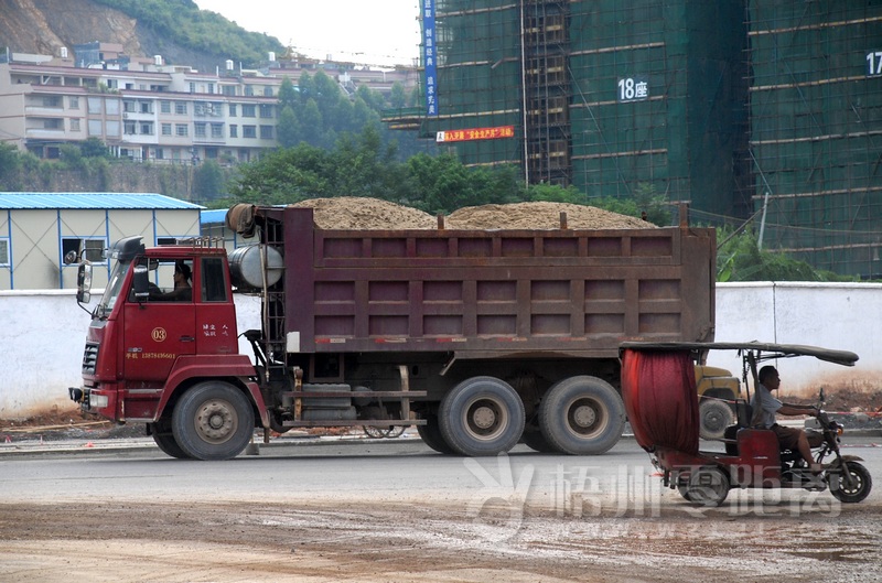 不少泥頭車并沒有按規(guī)定遮蓋蓬布,行走過程中不時泄下泥土。蒙紹松/攝