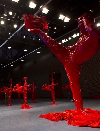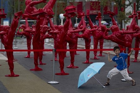 ??? 昨日,上海世博園浦西園區,一名小游客在“CHINA功夫”雕像群旁留影。當天,佛山案例在城市未來館揭幕,這是世博會歷史上第一個以陶文化為主題的展示。在一周的展期里,110尊紅色“李小龍CHINA功夫”陶瓷雕塑將與觀眾親密接觸。佛山案例還將邀請1506位游客擺出功夫姿勢留影,并面向全球尋找“CHINA功夫”代言人,優勝者有望獲得上萬元獎金。早報世博記者 魯海濤 圖