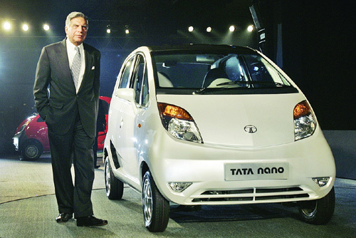 ????1月10日,印度首都新德里,塔塔集團CEO兼董事長攜世界上最便宜的汽車Tata Nano亮相2008年印度國際汽車摩托車零配件展覽會,這款車僅售2500美元。圖片來源:上海證券報