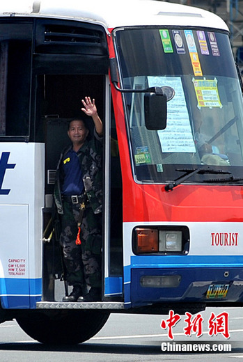 ????香港康泰旅行社23日證實,一個21人的香港旅行團在菲律賓馬尼拉被劫持。旅行團包括20名香港游客和1名香港領隊,其中有3名兒童。劫持者是一位被革職的警察。截止目前已有6名人質獲釋,其中包括3名兒童。圖為劫持者站在被劫持的旅游觀光車門口。
