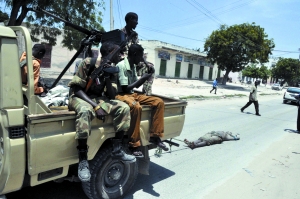 8月24日,索馬里摩加迪沙,政府軍用卡車(chē)拖著伊斯蘭武裝分子的尸體。