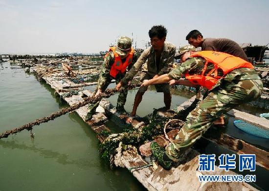 ????8月30日,邊防執勤官兵在閩南石獅的海上養殖區和漁船集中停泊點協助當地漁民加固漁排,抵御即將到來的強熱帶風暴“獅子山”。13時59分,福建省氣象臺發布臺風藍色預警信號,這是福建省今年發布的首個臺風預警信號。新華社記者魏培全攝