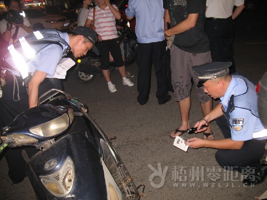 ??? 9月1日晚,公安民警在查對機動車證件。從當晚開始,市公安局在全市范圍內組織開展打擊盜搶機動車犯罪的集中行動。陳貽澤 攝