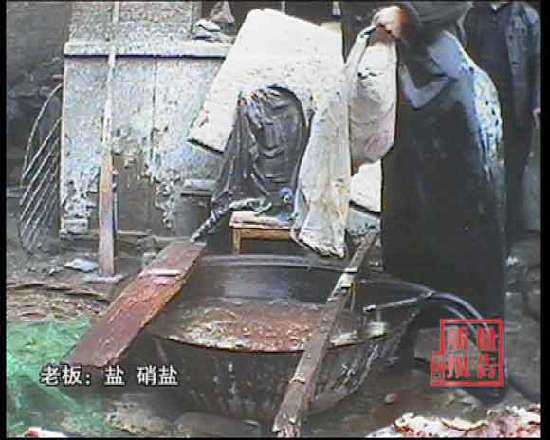 ??? 他告訴記者,往肉里打的并不是普通的水,而是自己配制一種特殊的藥水。眼看著鍋里的藥水用完了,老板拿來了一個袋子,往鍋里加了一些黃色的粉末,他說這就是用來調配的藥,是他這里做摻假牛肉必不可少的東西。