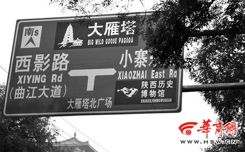 指示牌中大雁塔被譯成big wild goose pagoda,再翻譯成漢語就成了“大野鵝塔”。 記者 鄧小衛 攝