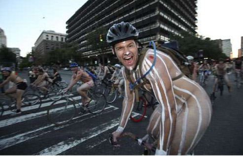 ????活動中,一部分勇敢前衛的男女全身赤裸騎車,其他人則或者在身上涂滿油彩,或者穿著泳裝,略略遮羞。