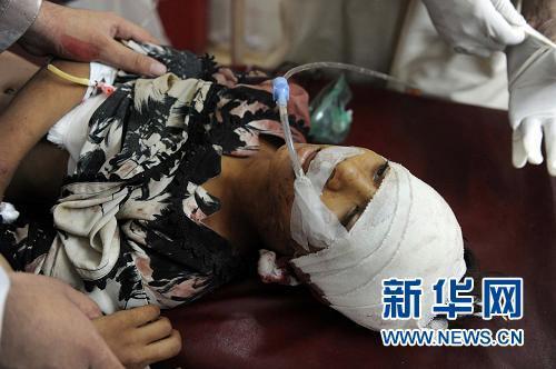 ????9月7日,在巴基斯坦西北部的白沙瓦,一名在爆炸中受傷的女孩在醫(yī)院接受治療。巴基斯坦西北部科哈特市一警察居住區(qū)7日晚發(fā)生自殺式炸彈襲擊事件,造成至少23人死亡、80多人受傷,傷亡者中大部分為警察及家屬。警方拆彈人員說,襲擊者使用了至少400公斤的炸藥。新華社/法新