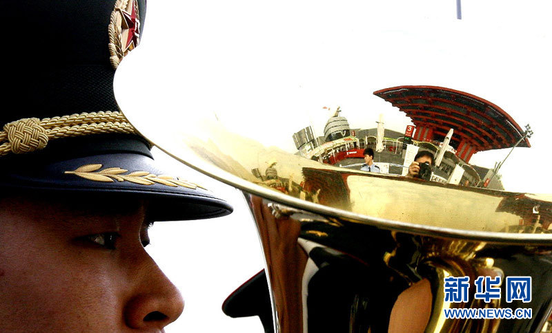 ??? 10月1日,在世博園中國館前廣場舉行的國家館日升國旗儀式中,中國國家館的影子映在軍樂隊隊員的樂器上。 新華社記者陳飛攝