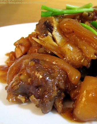 ????第一步:水煮。鍋內坐水,放花椒少許,生姜1塊,水開入豬蹄,水開二度,加一勺料酒,煮至血腥浮沫起,撈出豬蹄,溫水沖洗干凈備用;