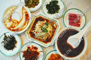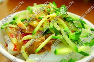 ????在西安,西安涼皮和羊肉泡饃、肉夾饃一樣,受到人們的青睞。現(xiàn)在的西安涼皮以秦鎮(zhèn)大米涼皮最受歡迎,其歷史悠久,可上溯至秦代,為秦鎮(zhèn)一帶百姓給朝廷的貢品。將陳年大米浸泡過夜,石磨成漿,沉淀,撇去上清,上籠蒸制,再加各種調(diào)料,即成秦鎮(zhèn)涼皮。秦始皇嘗過,綿軟爽滑,酸辣可口,大悅之下,遂免當(dāng)年賦稅,并指定秦鎮(zhèn)涼皮此后為皇家貢品。