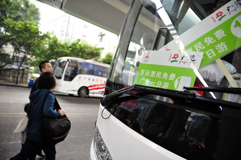 11月12日上午9點左右,游客準備乘大巴參加亞運惠民廣州免費一日游,共享廣州亞運盛會。當日,第十六屆亞洲運動會即將在廣州開幕。新華社記者梁旭攝