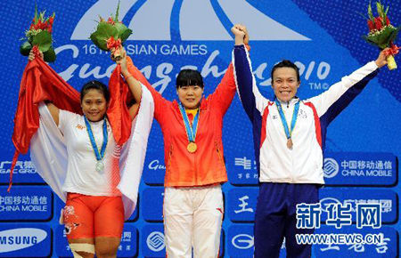 ??? 廣州亞運會官方網(wǎng)站11月17日報道 北京時間11月17日晚,廣州亞運會女子舉重69公斤級決賽在東莞體育館進行。中國選手劉春紅以總成績242公斤,其中抓舉110公斤、挺舉132公斤奪得金牌。印度尼西亞選手辛塔·達馬里亞尼以總成績238公斤奪得銀牌。中華臺北選手王雅珍獲得銅牌,總成績是233公斤。