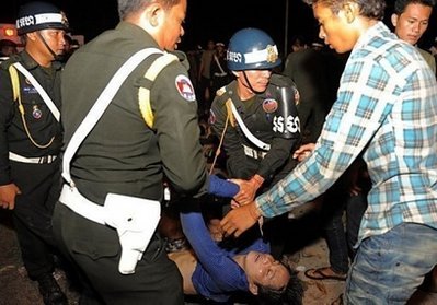 柬埔寨警方抬走遇難者遺體