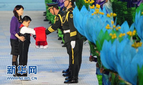 12月12日,視障兒童何宇軒(左二)緊隨母親將國旗交給旗手。新華社記者江宏景攝