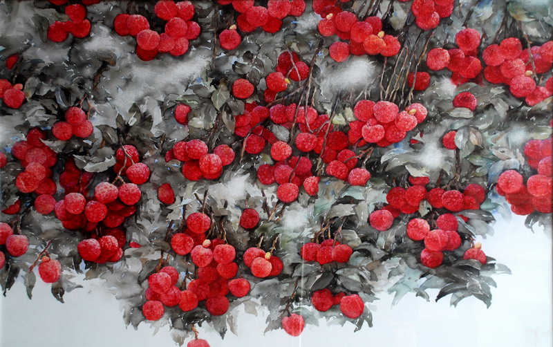 水彩畫的荔枝尚屬少見,畫面虛實相間,色彩著重表現荔枝、表現力強,作者是學院派成員之一,畫面細膩清新,用色大膽。作者在吸取國畫營養,既有傳統國畫特色,又有創新技法,中西結合,令人賞心悅目。