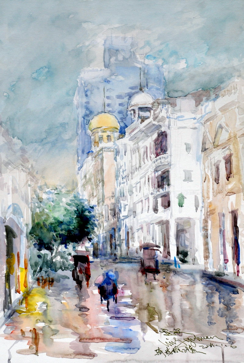 《騎樓城的故事》描繪家鄉本土風光撲面而來的是鴛鴦江風情,極富親切感,色調看似輕描淡寫卻表現出對家鄉濃濃的熱愛之情,色彩透明嫻熟。