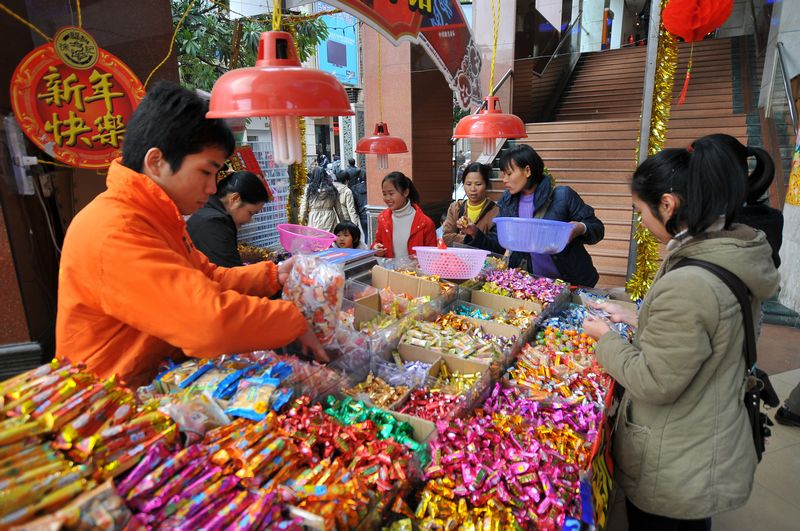 1月31日,在恒業國泰廣場內,人們在選購糖果餅干等各種年貨。新春佳節一步一步逼近,市民群眾開始成批購買年貨,各年貨市場的生意也快速升溫,呈現出火紅的景象。 李鴻榮 攝