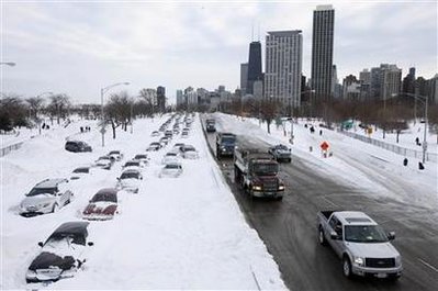 芝加哥多輛汽車被積雪困在馬路上動彈不得。
