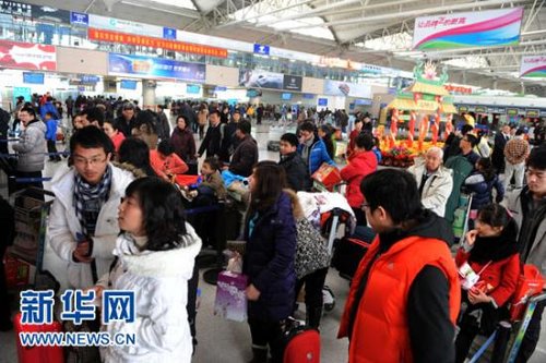 2月7日,旅客進入鄭州火車站候車大廳。當日是農歷正月初五,春節假期接近尾聲,鄭州火車站返程客流明顯增多。鐵道部發布的信息顯示,節后客流壓力將大大超過節前,第一個返程高峰將在2月8日出現。新華社記者 陳飛 攝