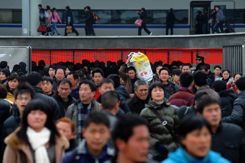 ??? 2月19日,前往廣東東莞方向的旅客在合肥站乘車。當日,合肥火車站日發送客流突破7萬人次,迎來了2011年春運最后一輪客流高峰。