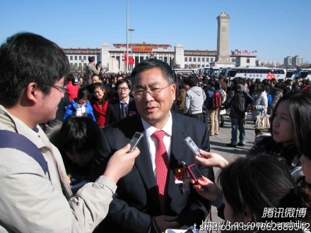 ??? 陳志列:從大會(huì)堂東門(mén)拾階而上,若想突圍1千多人的記者陣,最好的辦法就是低頭往前走。但是正好遇到一個(gè)深圳的記者把我攔下,要求和我們深圳的委員們合影,結(jié)果一下子就又涌過(guò)來(lái)很多的麥克風(fēng)要求采訪(fǎng),這才發(fā)現(xiàn)我被包圍了。等我采訪(fǎng)完了,那邊的合影也結(jié)束了。借用一下這位記者的照片,我在人堆里。
