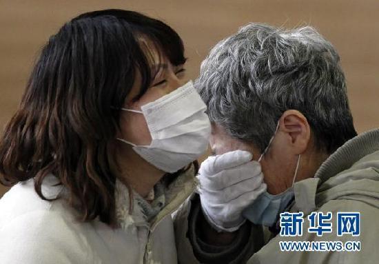 3月15日,在日本巖手縣的一個臨時避難所內,一名婦女與親人團聚后哭泣。 新華社/路透