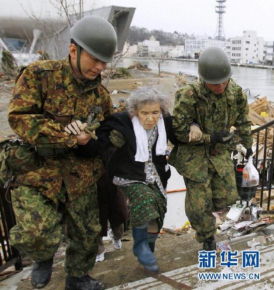 3月15日,在日本宮城縣,一名婦女被困在一個孤立的避難所近5天后被救援人員救出。 新華社/路透