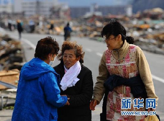 ??? 3月14日,在日本宮城縣南三陸町,幾位相識的災(zāi)民路上偶遇時相互問候。日本宮城縣南三陸町在11日強震引起的大海嘯中,主要區(qū)域幾乎被夷為平地。死傷、失蹤者估計超過1萬人。14日,記者在災(zāi)區(qū)看到,廢墟前時有災(zāi)民經(jīng)過,他們有的在尋找家的位置,有的從較遠的損失不重的親戚家拿來少量的水、食品,有的在整理破敗的房子......他們對記者說,能活著已經(jīng)是奇跡了,接著要重建家園,堅強地生活。 新華社記者 季春鵬 攝