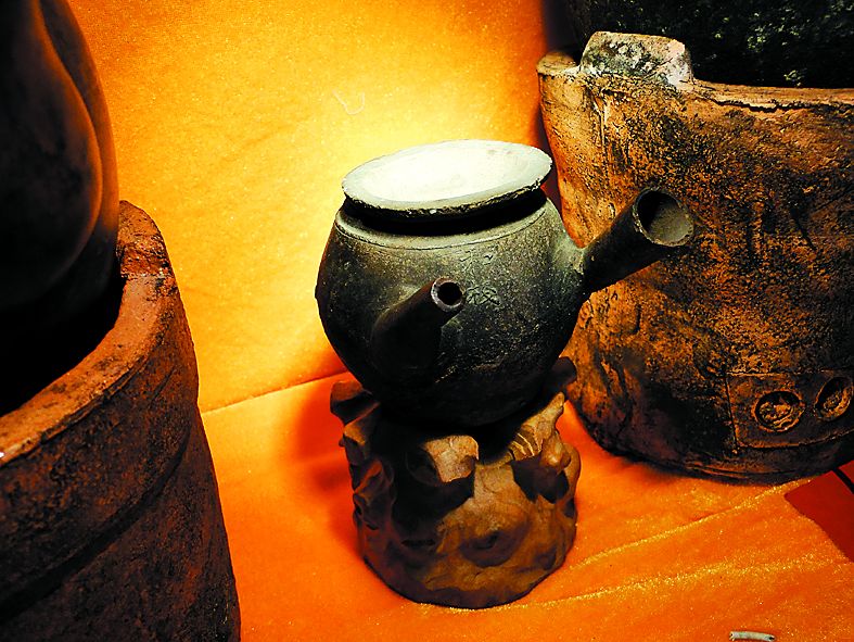 ??? 在六堡鎮各個茶區,當地人至今仍保留著煮茶的習俗。茶選用的是老茶婆或中茶,而茶壺則有專門用于煮茶的陶制“茶急”,喝茶的是用瓷碗和大的瓷杯,不過到了現代多是直接用玻璃杯喝了。據當地老茶人介紹,現在六堡人敬神的時候,還必須采用這種煮茶的方式,而且流傳下來有一套較為固定的程序。圍坐茶桌,煮茶喝茶也固有一套規矩,茶娘居中,茶杯擺成一圈。茶急洗滌干凈,把茶放入沖洗干凈,放在風爐上煮,等到水將開時,輕刮去浮沫。此時,茶香滿室,余香裊裊。第一杯茶,須先敬神,專門有個杯子,是不喝的。接著,先敬座位中老人長者,長幼有序,遞茶者須雙手為敬,接茶者也要雙手接茶,并致謝為禮。這套古老的茶藝體現了六堡茶鄉悠久的歷史文化,也體現出敬老愛老、和諧互敬的中華民族傳統美德。