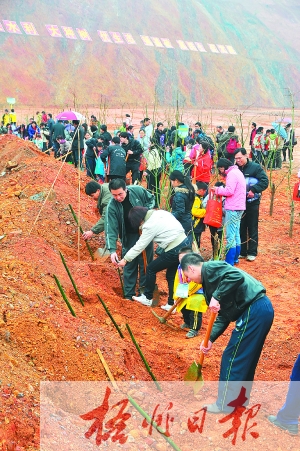 3月19日,一個市民家庭在市區(qū)外環(huán)路儒龍隧道附近地段挖坑種樹。