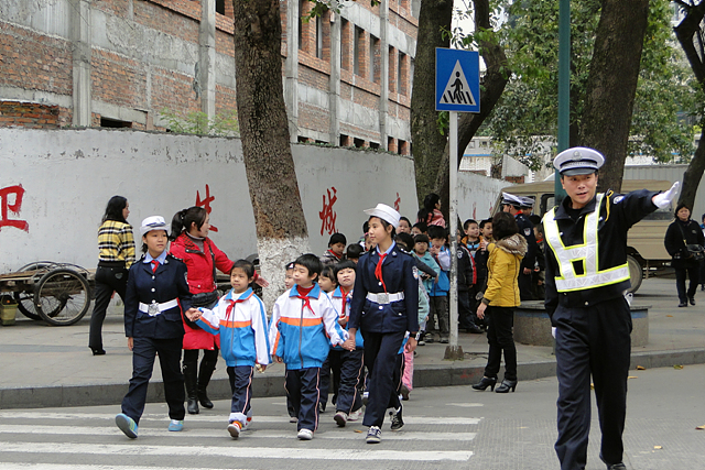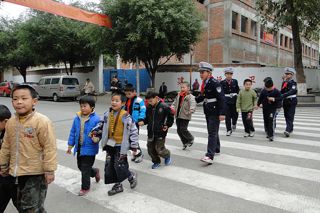 少年警校的學員在交警教官的指導下,帶領該校的低年級學生過馬路。