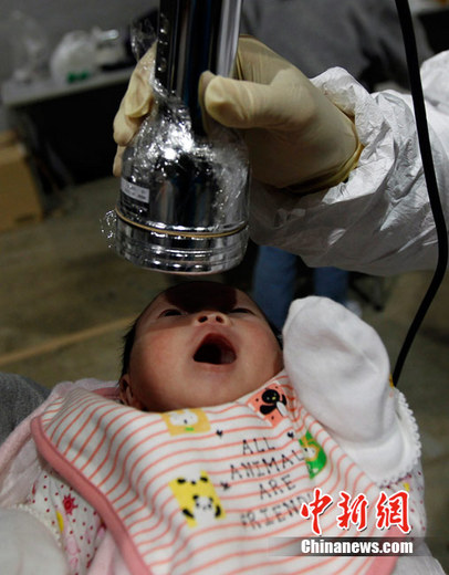 ??? 2011年3月31日,日本福島縣一個避難所內,出生于3月15日嬰兒Nagashima Rio正在接受核輻射檢測。她所在的避難所距離福島第一核電站大約70公里。而他所出生的醫院距離福島第一核電站只有約50公里。