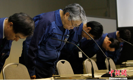 ????2011年3月28日,東京,東京電力公司召開新聞發布會,通報福島核電站最新輻射情況,公司高管就“福島核電站積水輻射超標數值錯誤”的問題,向民眾鞠躬道歉。