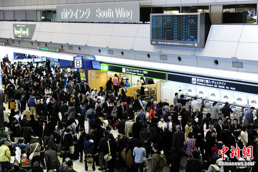 ??? 3月12日下午,因11日發生的日本東北地區大地震而滯留東京羽田機場的大量旅客正在排隊等候最新的航班情況。中新社發 侯宇 攝