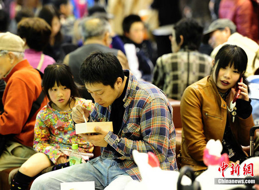 ????3月12日下午,因受11日日本東北地區大地震影響而滯留東京羽田機場的旅客吃盒飯的同時也在等待最新的航班信息。中新社發 侯宇 攝