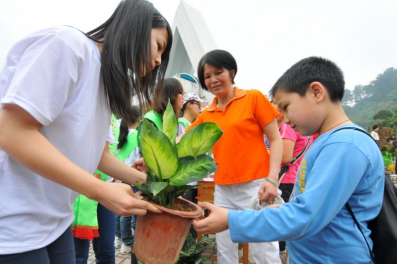 ?4月16日,在白云山公園門前,青年志愿者向一名小孩子發放盆栽。李鴻榮 攝