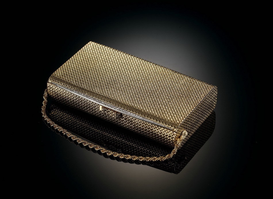 ??? 已找回展品——金鏨花嵌鉆石手袋。 作者:梵克雅寶。材質:金,白金,鉆石(金火機一個,皮套一個)。尺寸:15*8.8*3.2cm。時代:1950-1960年