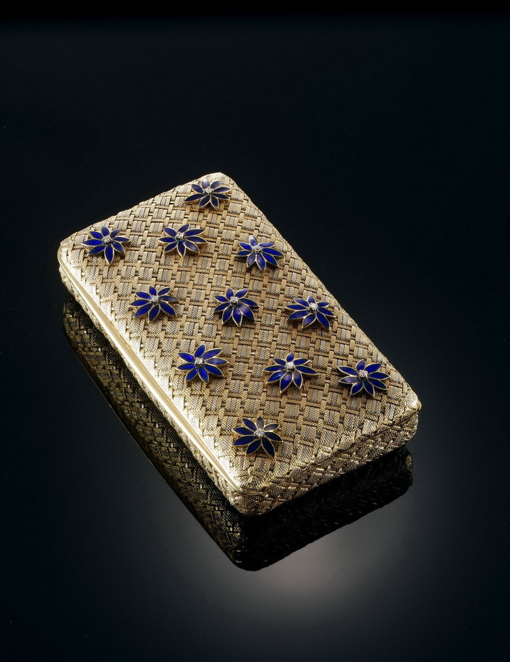 ??? 失竊展品——金嵌琺瑯花飾化妝盒。 作者:蒂芙尼。材質:金,鉆石,琺瑯(粉隔)。尺寸:8.1*4.3*2cm。時代:1950-1960年